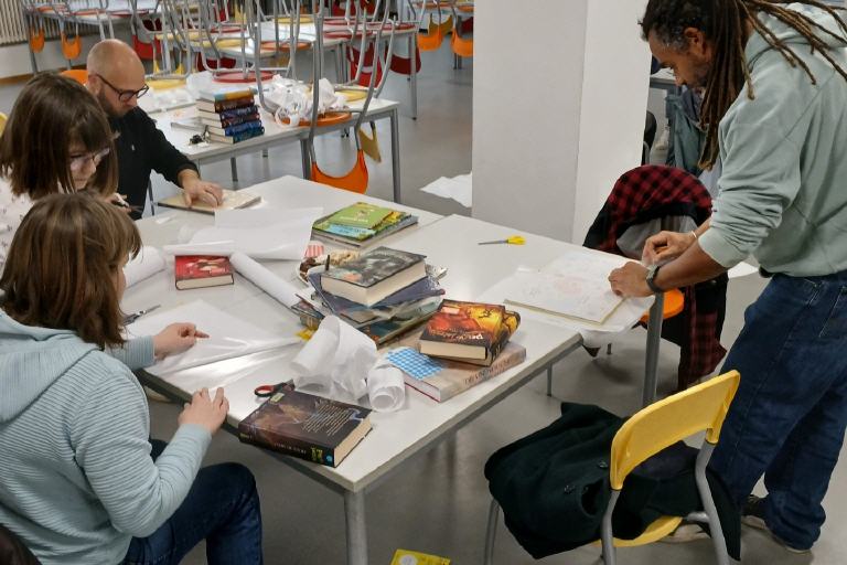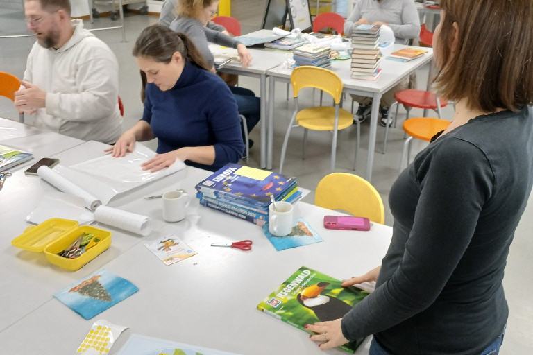 An einem Samstag im November trafen sich Eltern bei Kaffee, Tee, Schokolade und Gebäck freiwillig in unserer Schulbücherei zur Arbeit. Wir brauchten Unterstützung beim Einbinden unserer neuen Bücher in Klebefolie. Mit Hilfe des Schulelternbeirats konnten wir einige Eltern für unseren Aktionstag gewinnen. In schöner Atmosphäre schnippelten, quatschten und klebten wir gemütlich zusammen. Zum Schluss waren fast alle Bücher geschafft. Wir möchten uns ganz herzlich bei allen bedanken, die geholfen haben.