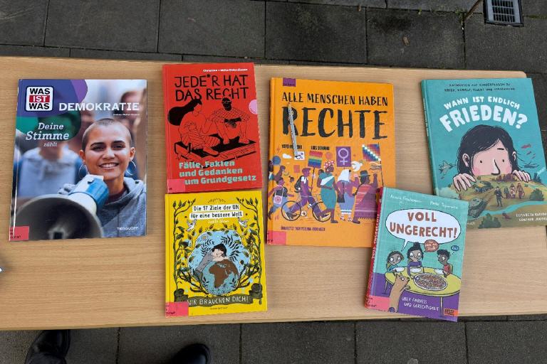 Gleichzeitig konnte man sich an einem Thementisch informieren. Welche Kinderrechte gibt es? Gelten die Rechte überall auf der Welt? Heißt das, dass Kinder alles dürfen? So entstanden interessante Gespräche. Dabei wurde in Büchern geblättert und diskutiert.