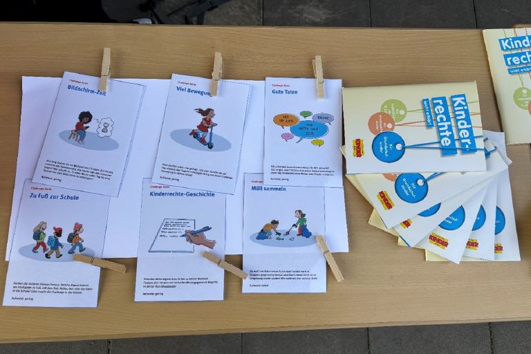 Den größten Andrang erlebten die Challenges rund um das Thema Kinderrechte und die selbst gestalteten Lose mit guten Taten. Die Kinder zogen kleine Zettel und versuchten den notierten Auftrag zu erfüllen, zum Beispiel „Sei nett und freundlich!“, „Hilf jemandem, der in Not ist!“ oder „Tröste ein Kind!“. Außerdem forderten sie sich gegenseitig heraus: Welche Klasse läuft am meisten zur Schule? Wer hat die geringste Bildschirmzeit und wer die höchste Bewegungszeit? Welche Klasse hält ihre Umwelt sauber und sammelt am meisten Müll auf?